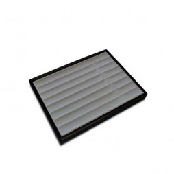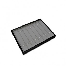 Wooden sample tray, lined carbon fabric with braided texture, for jewellery and costume jewellery. The fabric with which the tray is lined adds a touch of distinction and elegance to the presentation of the jewels. In addition, the trays are easily stackable.