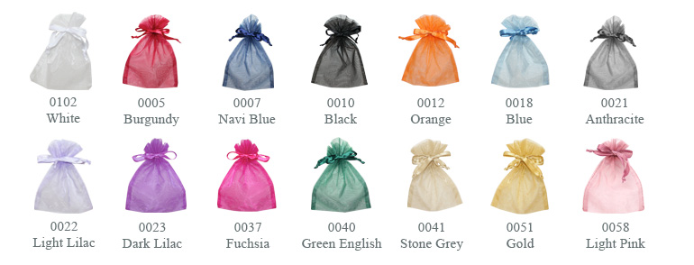 An economical choice for your jewellery. Organza pouches are a simple and cheap way to present jewels and custom jewellery, or any small gift. The sheen of the organza and the transparency make them a nice decorative complement to jewellery boxes or as jewellery packaging.
