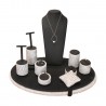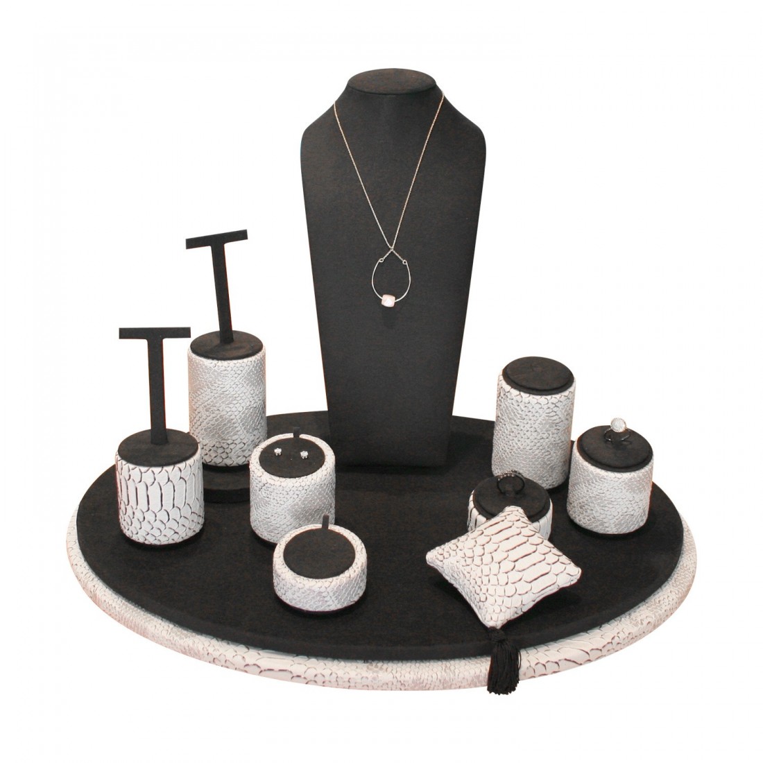 The Sfèric Oval Luxe is a jewellery display set with rounded and seductive shapes. The stylized lines of all the stands, and the fabric imitating snake skin, bring to this display set the definitive touch of elegance and sophistication.